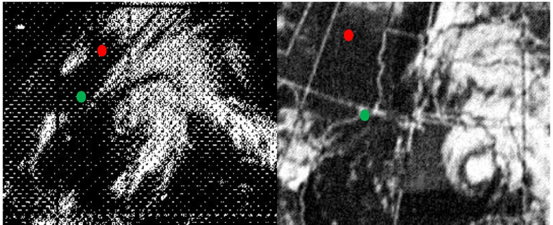 Figure 4.10.47: ATS (left) and ESSA (right) images of the Gulf and Hurricane Gladys from different sources. On the upper images, the red dot identifies Fort Worth, the green dot Galveston.