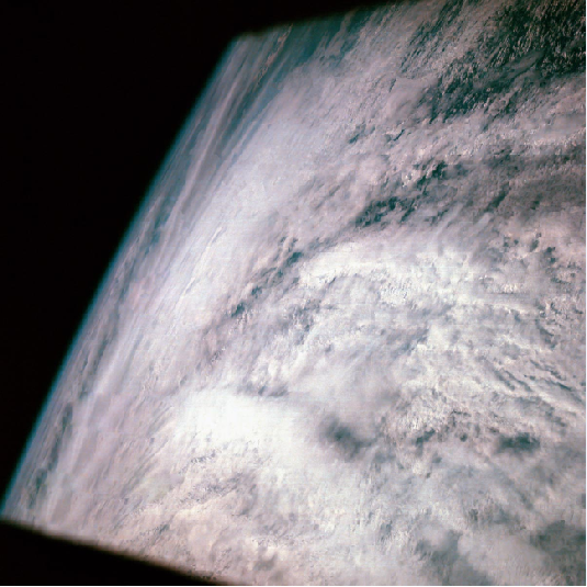 The ESSA satellite images covering the mission period can be found here, and the ATS ones here. There are several additional images covering the mission dates in this publication: Applications of Satellite Meteorology, that are of better quality than the ESSA mosaics. We also have the benefit of another ESSA World publication (found here ESSA World) that deals specifically with the weather aspects of the mission. The article expands on the edition referred to in Chapter 2, and describes the work of the Spaceflight Meteorology Group with specific reference to Apollo 7 from the preparation of the launch vehicle to the choice of landing areas. This article has good quality ESSA and ATS views of two hurricanes photographed during the mission.