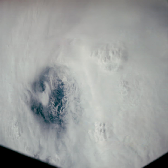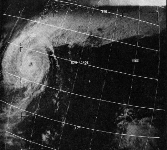 About 12 hours after these images were taken we have photographs of another tropical storm, Typhoon Gloria. Two images were taken showing the centre eye and some of the surrounding wall of cloud, ut they aren’t zoomed out enough to confirm the details in the available ESSA image. Figure 4.10.56 shows the images.