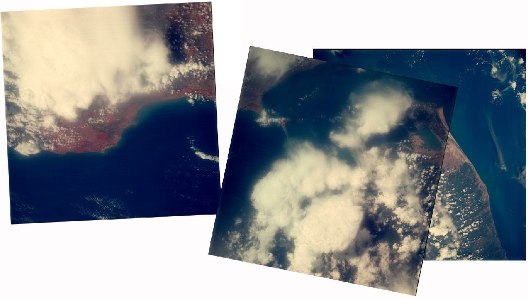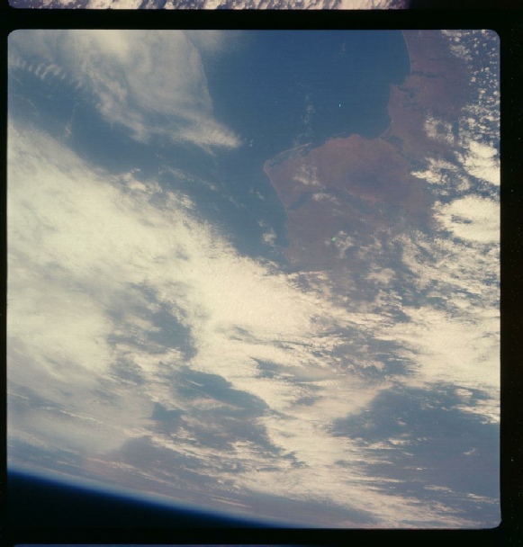 The satellite image shows complete correspondence with the Apollo image. The spacecraft is above the large mass of cloud to the left of centre looking towards the relatively clear Gulf (there is a suggestion of hazy cloud), beyond which is the American Continent with more substantial cloud in the distance. Should anyone care to check the records either side of this image, they will find that clear skies prevail off the coast of North America, and once again this can be the only day on which the photograph could have been taken.