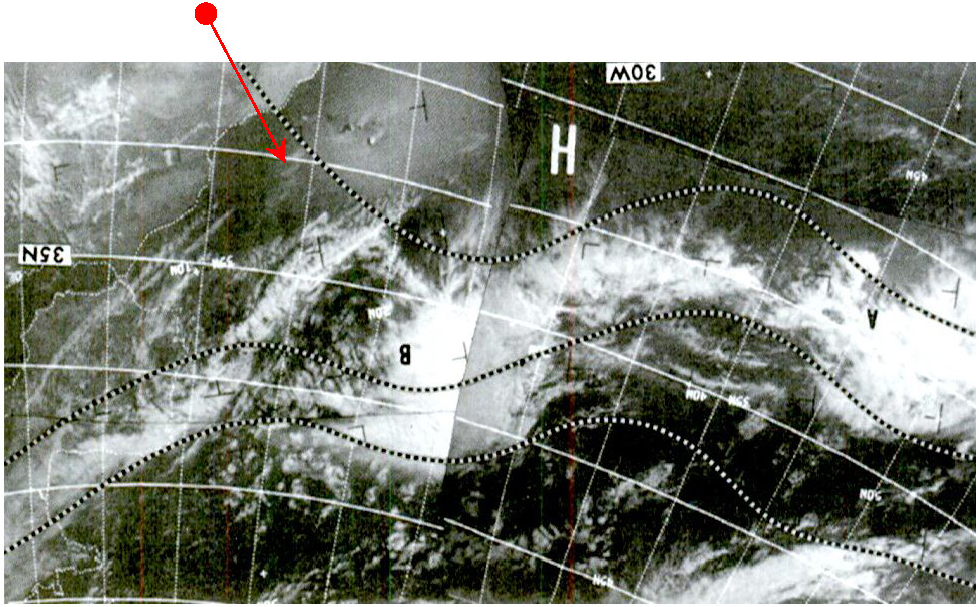 One of the first magazines used (M) contains a photograph of a weather system that is also featured in the Applications of Satellite Meteorology document, and occurs early on in the mission. The image in question is shown overleaf in figure 4.10.33. The ASM document identifies this as a low pressure trough in the mid-
