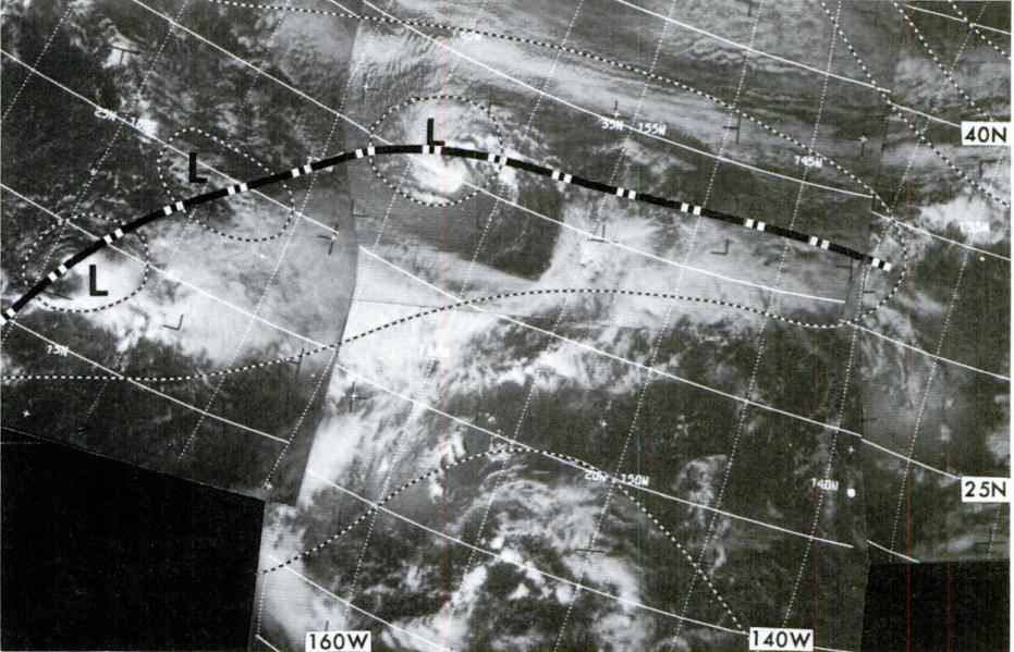Most of the photographs taken over the next couple of days are of landscapes free from cloud or of weather patterns too faint to be visible on the ESSA mosaics in use here. One day’s data (from the 14th) is missing from the ESSA photomosaic data completely but there is one image shown in the ASM document off the Canary Isles. The image is recorded as being taken in two passes between 15:00 and 16:50 GMT. These are not the times recorded for the appropriate passes in the data collection, so it is likely to be from a different ESSA satellite. It is given in figure 4.10.40.