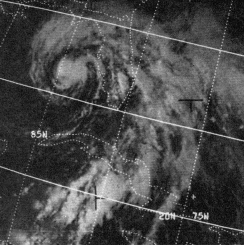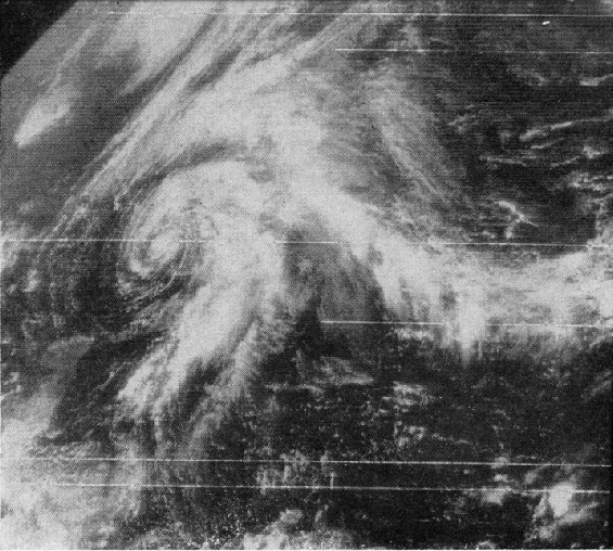 The central whirl of cloud in the preceding figures is so clear it needs no illustration with arrows, but it is worth noting that the satellite image from figure 4.10.29 was taken some 21 hours before the Apollo image. The satellite photograph in the ESSA data catalogue from the 11th was taken some 4 hours later and is show below in figure 4.10.35, along with the ATS-