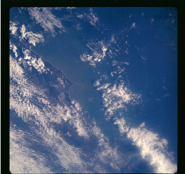 On the following day, the crew begin a sequence of images starting over Hawaii (although not actually featuring Hawaii), and ending in the region of the Bahamas. There are two parts of this sequence that can be picked out from the satellite record, the first at the coast where Apollo 7 picks out an area of cloud, and the second in the centre of the north American continent where there is a small area of distinctively shaped cloud in an otherwise cloud free zone.