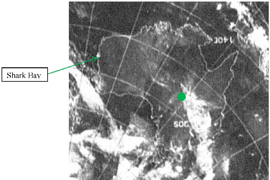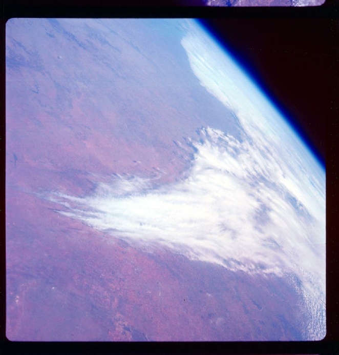 One continent so far missing is that of Australia. The crew did take several sets of images of Australia, sometimes trying to capture the Carnarvon and Honeysuckle receiving stations as they passed over. Most of these photographs show no or very little cloud, but one image of central Australia shows an apparently considerable band that ought to be easier to pick out on the satellite image.