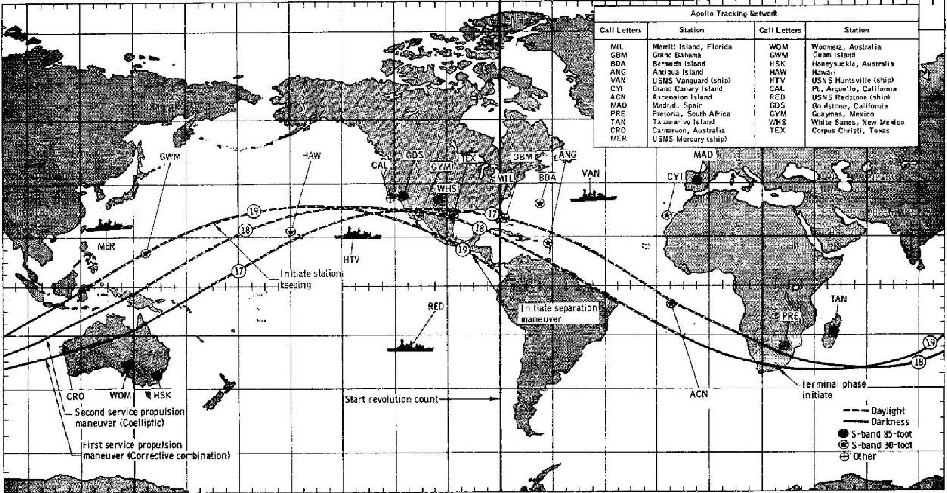 These low orbit missions are moving at 17000 miles an hour, and consequently require a huge number of tracking stations to keep voice communications relayed successfully. Figure 4.10.32 shows the orbital path of Apollo 7 and also lists the various tracking stations involved. The mission transcripts are littered with notifications of impending communications hand overs and acquisitions, and there are breaks in communications where the on-