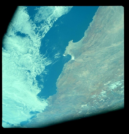 Once again we have, despite a low resolution and poor quality image, a satellite mosaic that still manages to be consistent with an Apollo photograph, with the coastal city visible on both pictures surround by patchy cloud. On the preceding day the ESSA image shows the area to be covered with cloud, and on the following day it is completely clear. Track 1 on the 19th was commenced at 15:09,. Compared with the Apollo 7 photograph’s recorded time of 12:39.