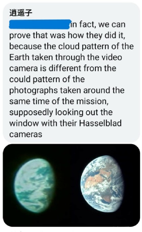His claim is that because these two images are different, they are fake. He obviously isn’t aware that there are other Apollo 11 views of Earth, that they can all be timed precisely, and that the reason these two Earth views don’t match is because they were taken several hours apart. If he compares it with one taken at the same time, ie AS11-