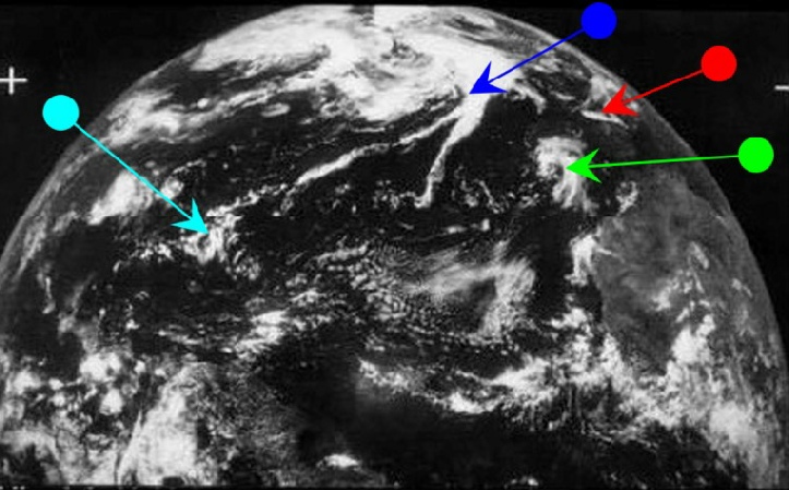 The ATS image time is still the same, but ESSA's terminator orbit as moved on to number 1766 (track 2), and commenced at 17:06. The NIMBUS equivalent was commenced at 13:28 (pass 1264, with the blue arrowed storm imaged at 13:57), and both these timings can be compared with the SkySafari estimate of 19:00.