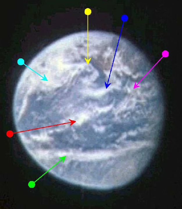 The magenta arrow is pointing to the storm system of Brazil, and the 'streamers' are on the system identified by the blue arrow. We therefore have an Apollo image showing perfectly the weather systems visible on satellite images, but the astronauts are able to describe the weather conditions to the ground.