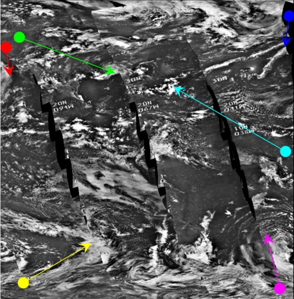 In the preceding figure, the blue, cyan and magenta arrows have been used to identify the same weather systems as shown in figure 4.3.18. The red arrow identifies the remains of Hurricane Bernice, just visible on the western limb.