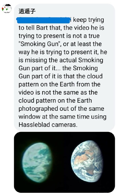 His wild assertions about the meaning in the communications from the ground, and Collins’ facial expressions) are beyond ludicrous. He’s made several videos about Earth footage, and he fails every time to focus on the main issue: the weather, and the view of it only being possible from a spacecraft in cislunar space.