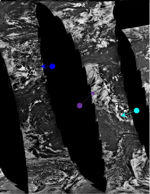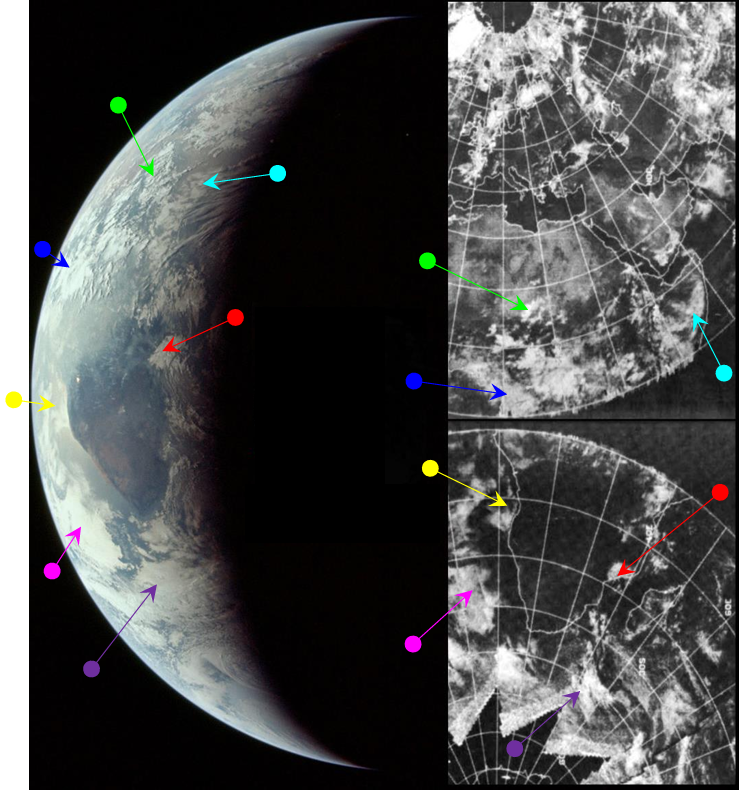 Life is complicated even further by the fact that as the image features Africa, the area visible on the western limb features weather patterns shown on the ESSA image dated the 24th, while those over the Indian ocean are the last featured on the image dated the 23rd. For this reason, sections of both ESSA mosaics are included. The NIMBUS data are poor quality and much of the area visible is either not available or difficult to make out, and for this reason only the blue and purple arrows are used with any confidence, and only ESSA has a 3D reconstruction.