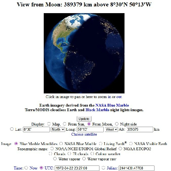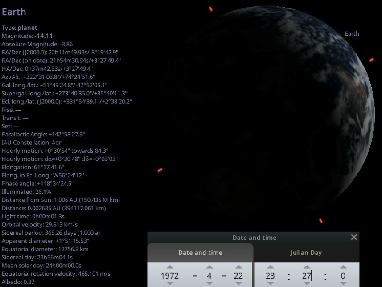 Figure 4.8.7.3: Stellarium and Fourmilab views of Earth at the time of the TV broadcast