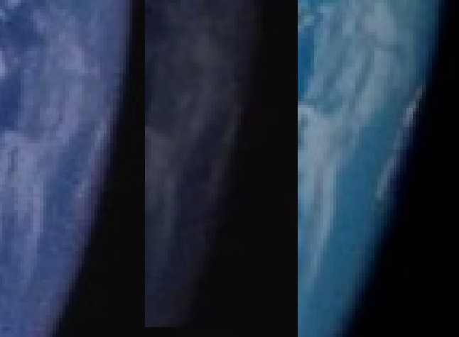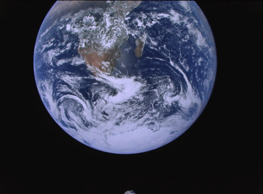 Now that we have the full Earth in view, another comparison possible is of the Apollo still and 16mm images. The two are taken around 90 minutes apart, and if the viewpoint was from a stationary point above the Earth there would be no change in the landmass visible. If it was from a geosynchronous orbit, more of the south American continent would be visible as these go against the rotation of the planet. Instead (this is more obvious in the full size stills), we have more of Asia visible in the later still photograph, which indicates a movement both with and faster than the rotation of the Earth as it travels away from it – launches were in fact arranged that way to capitalise on the momentum this rotation gave the Saturn V.