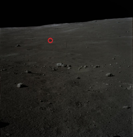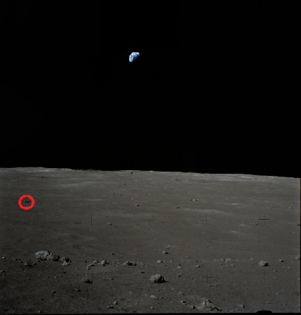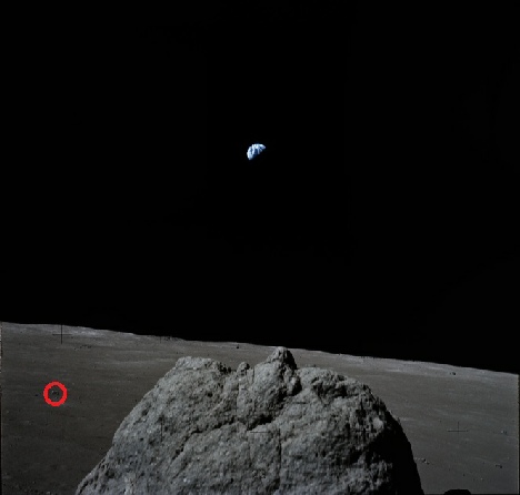 While he’s there, probably prompted by capcom’s mention, he snaps three additional views of Earth. We can tell that these photos were taken from this location, rather than below the boulder, by looking at the position of a few rocks in the image (figure 4.9.7.8).