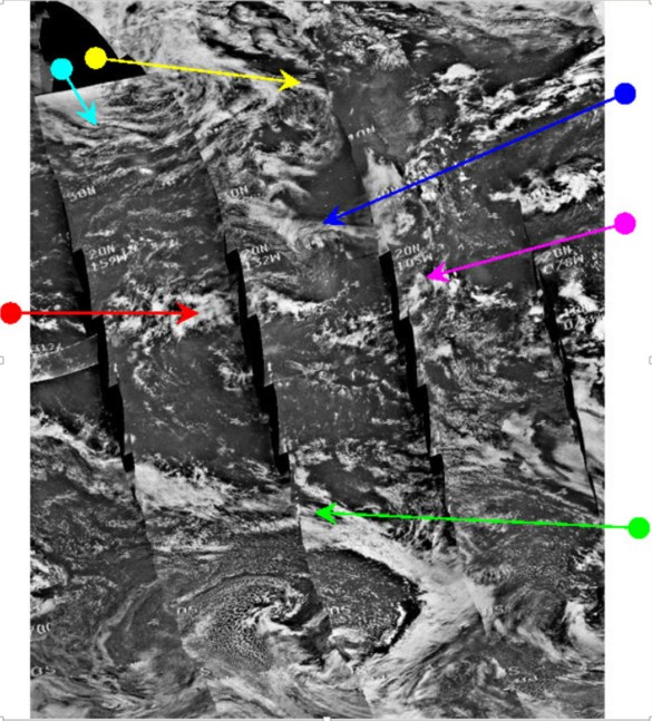 In the preceding figure, the blue, cyan and magenta arrows have been used to identify the same weather systems as shown in figure 4.3.18. The red arrow identifies the remains of Hurricane Bernice, just visible on the western limb.