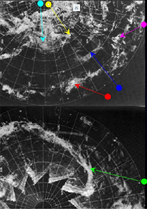 Going back to the transcripts, ss usual, what they describe is what they should be able to see. The storm to the south west of Alaska is identified by the green arrow. The cloud across the south-