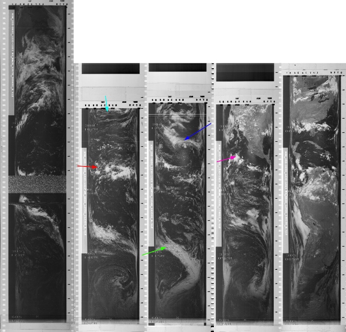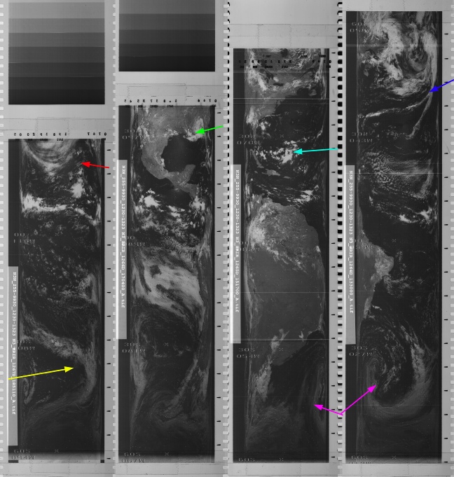 The magenta arrow is pointing to the storm system of Brazil, and the 'streamers' are on the system identified by the blue arrow. We therefore have an Apollo image showing perfectly the weather systems visible on satellite images, but the astronauts are able to describe the weather conditions to the ground.