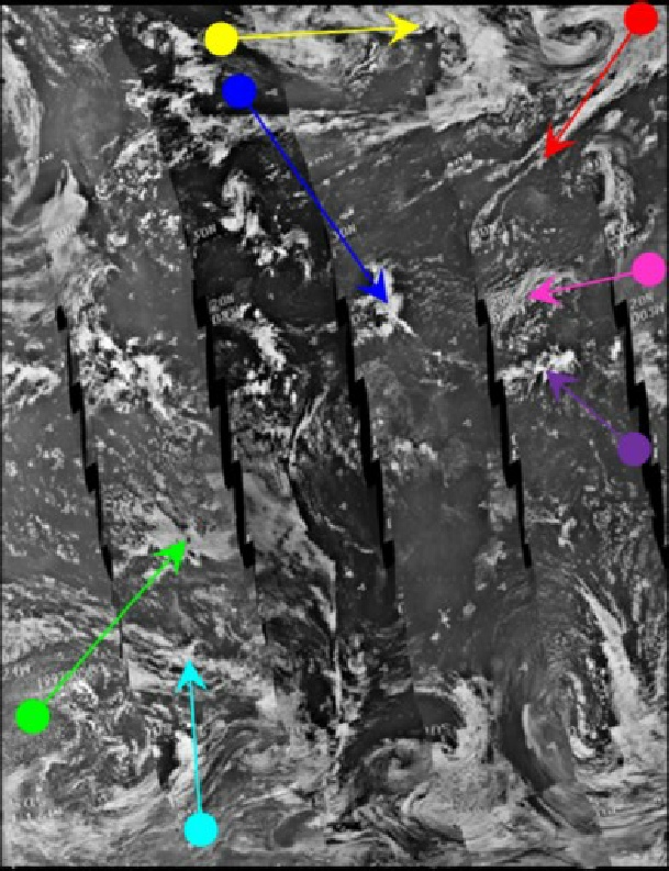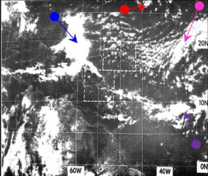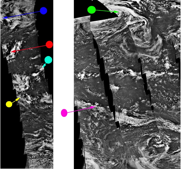 The observant reader will have noticed several more images in figure 4.3.3.9 than is usual, with the additional images coming from detailed sections of an ATS image from a journal, , ATS strips from a University of Wisconsin report, and an ESSA image from the BOMEX study referenced in the introduction to this section. The cyan arrow in figure 4.3.35 picked out the area between a pair of parallel clouds, which in this figure have been picked out by the magenta and purple arrows, as using both clouds allows more detail to be picked out in the zoomed in ESSA & ATS image.