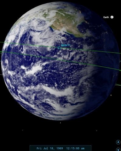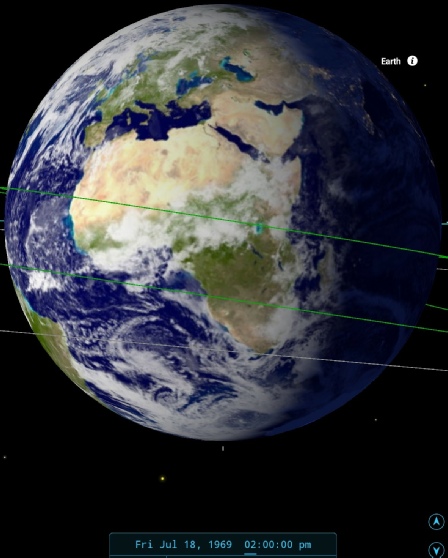 This puts the view of Earth just before the end of the TV transmission at around 22:10 on the 18th. SkySafari's view in figure 4.3..3.11 shows that the description is accurate. It’s worth noting that the final NIMBUS-3 orbit covering the image was only started 15 minutes before that comment by Armstrong.
