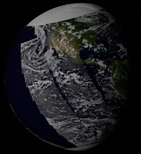 Although the detail in the screenshot is not perfect, it is still possible to make out the long band of cloud just north of the Equator (red arrow), and the banks of cloud off the California coast (green arrow). The much lower latitude band of cloud off South America is also evident (blue arrow). The magenta arrow suggests the location of the cloud around the Florida coastline, but it is not absolutely certain. There are also differences in colour between the areas that should be occupied by ocean and land. In short, the screen capture is consistent with a planet Earth that has rotated over the short time interval since figure 4.3.3.9, and shows the weather patterns it should show. The higher quality screenshot, found much later in the writing of this piece, confirms these observations.
