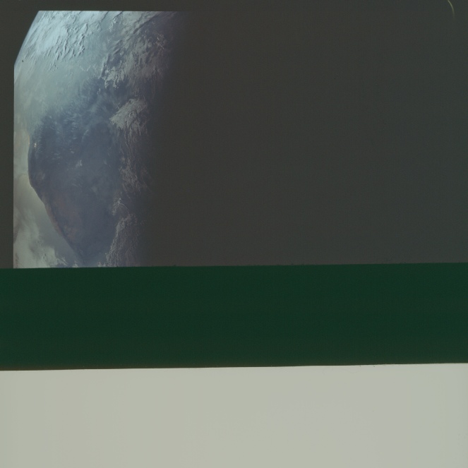 The photograph is only a partial one, they’ve almost run out of film, and it ostensibly shows the same features as the the previous ones in the frame: Africa dominating the sunlit part of Earth. Figure 4.3.9.16 shows the image, and some key details in it in comparison with AS11-
