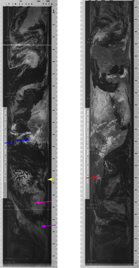 Life is complicated even further by the fact that as the image features Africa, the area visible on the western limb features weather patterns shown on the ESSA image dated the 24th, while those over the Indian ocean are the last featured on the image dated the 23rd. For this reason, sections of both ESSA mosaics are included. The NIMBUS data are poor quality and much of the area visible is either not available or difficult to make out, and for this reason only the blue and purple arrows are used with any confidence, and only ESSA has a 3D reconstruction.