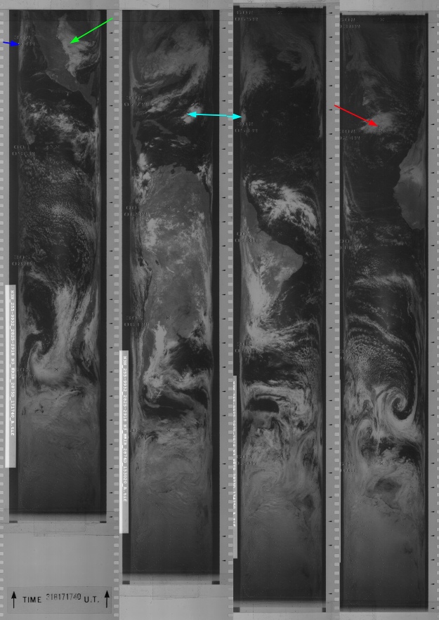 Returning to the satellite imagery analysis, the Apollo image has a number of unique features that are easily visible on the satellite photographs, particularly the large 'tick' shaped feature sweeping from the Mexican coast across the Gulf and up the east coast of the USA. The weather patterns either side of the tip of south America are also very distinctive and easy to spot on the satellite images.