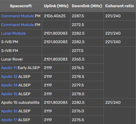 Figure 5.11.15: Apollo frequency assignments (source given in text)