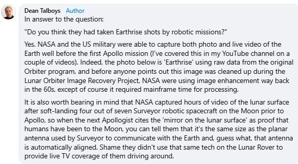 This seems to be the argument the hoax community have decided on. It gets them out of a hole nicely. With the claims of the main fraudsters and charlatans completely discredited by this research (it clearly isn’t a transparency overlaid on a window, neither was it filmed in LEO), this is the only recourse for them.