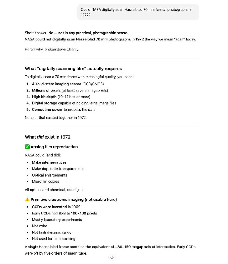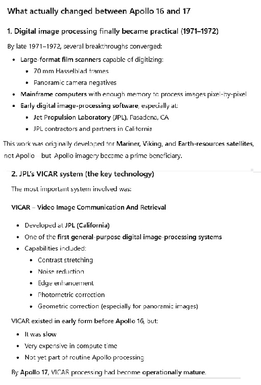 The next set of claims around photoshopping comes from (again) from someone interrogating AI until it gives them the answer they want. The claim is that large format scanners and image processing software were developed in time for Apollo 17 that allowed image manipulation. How that worked for the already widely published image catalog for the Apollo missions prior to that isn’t made clear. The two specific bits of kit mentioned are “large format scanners” and JPL’s ‘VICAR’ software. I’ve shown them in figure 5.3.11 so that no claims of misrepresentation can be made, together with a rebuttal from the same AI software .