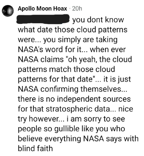 We have similar arguments employed in response to a comment regarding an Apollo 17 TV transmission specifically, and (some time later using someone else’s Facebook account) weather satellites in general (figure 5.9.28)