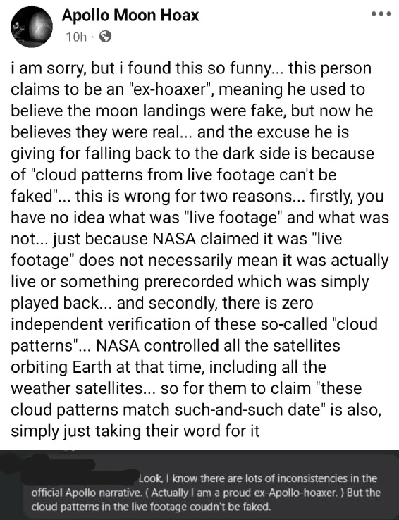 We get a recent and particularly aromatic addition to this particular section in the form of a facebook post on a moon landing hoax group, a group that helpfully collects all the world’s stupid in one place where we can keep an eye on them.