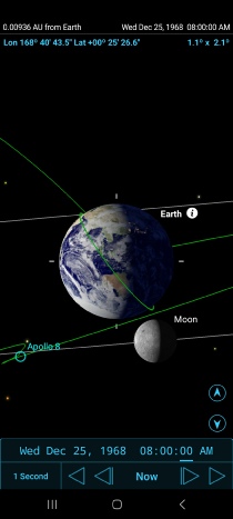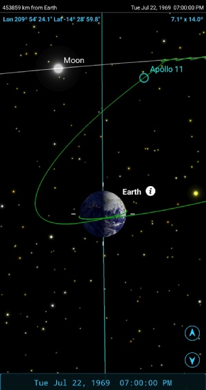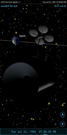 The app shows not only that the images show exactly what they should, but why: the Apollo 11 craft is not in a direct line of sight between Earth and moon, because the moon has moved on and Apollo I effectively looking to one side.