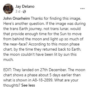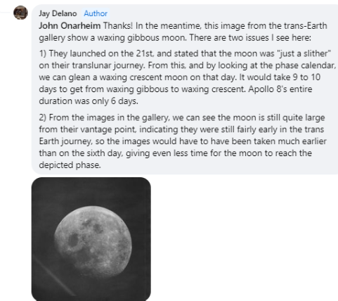The basic tenet of the post is that a NASA film discusses astronauts taking photographs on the way to the moon, while the astronauts themselves say they couldn’t even see the moon until they got there, thanks to the orientation of their spacecraft. They then go on to cry foul at the moon’s phase, saying that they should be seeing a different phase compared to that of the photograph used in the film. Here’s the exchange: