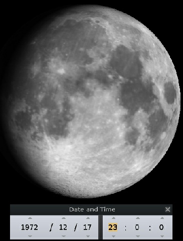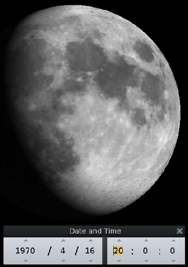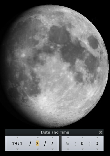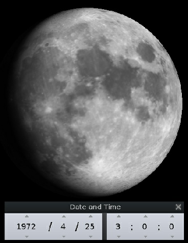 If this is compared with the Hasselblad image, we can see that they were taken at roughly the same time, but the view given by Stellarium shows that we are still not looking at it from a terrestrial perspective. Not surprising, as we are still 19 hours from re-