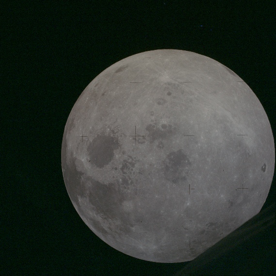 Apollo 15 fares slightly better, supplying a few images appropriate to this little study. Two of the magazines consist solely of lunar images, but Magazine 88 shows images of the lunar surface, lunar orbit and Earth taken from lunar orbit as well. This mission also featured the first use of the mapping camera, and one magazine specifically shows whole disk images taken after TEI, which happened at 21:22 August 04 1971.