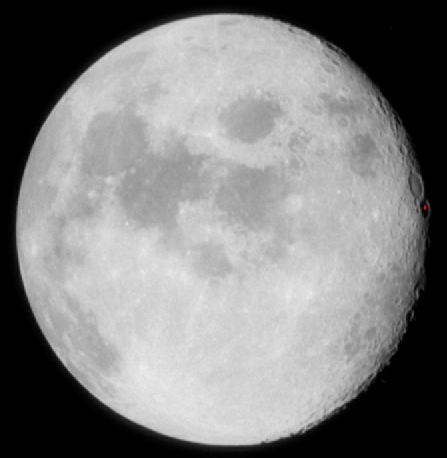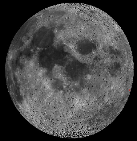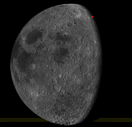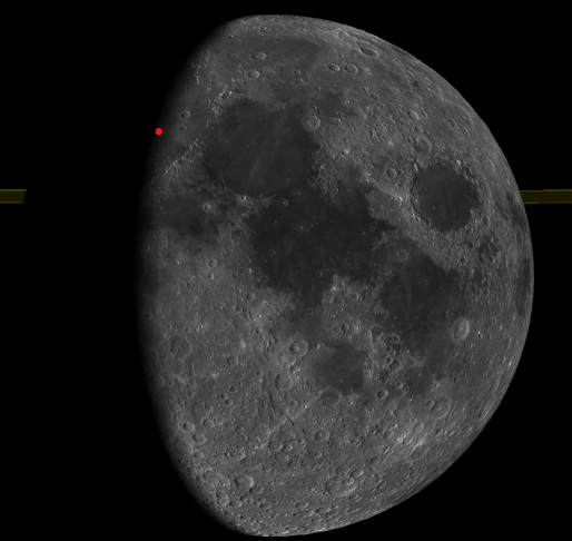To help with identification, I’ve marked a crater (Cantor) on the terminator with a red dot. Pasteur and Hilbert craters near the equator are also useful pointers. It is again noticeable that the two dimensional representation of the moon at 21:30 on the 21st is not the same as Apollo’s image of a 3D moon.