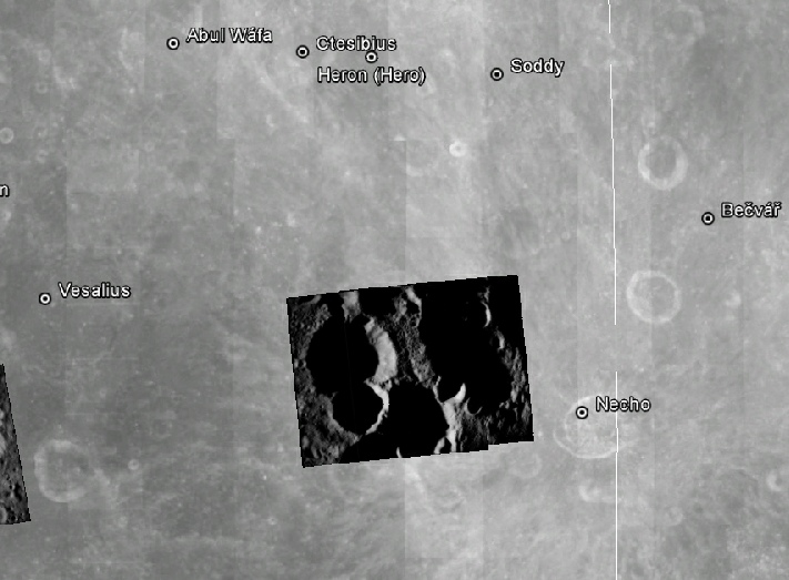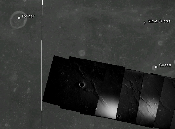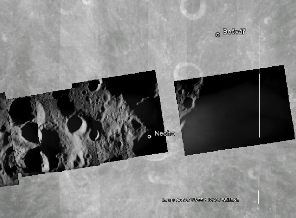 This magazine doesn’t show a terminator to terminator strip, and the transcript gives us a clue from revolution 44. They discuss camera problems they’d had when trying to photograph targets of opportunity, and the suggestion is to start the stereo strip but terminate it at a point that would allow them to continue their other photographic work. A time of 16:20 on the 21st (based on the transcript timings) has been set for the VMA, and the Google Moon and VLRO screenshots are shown below.