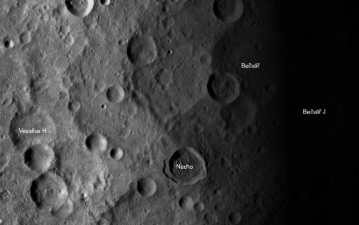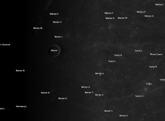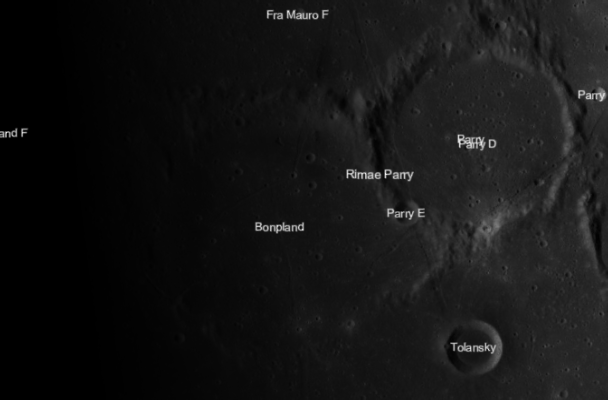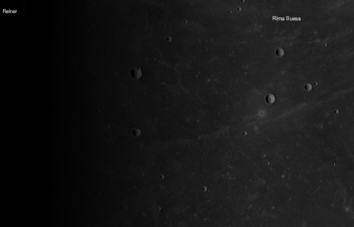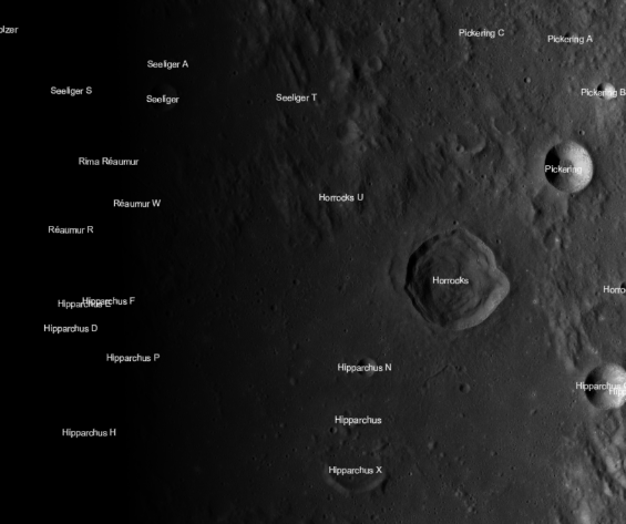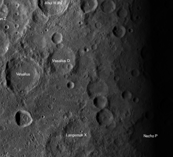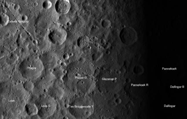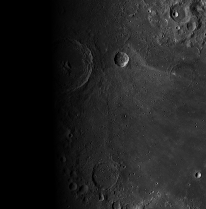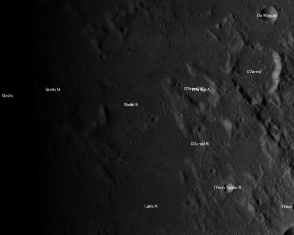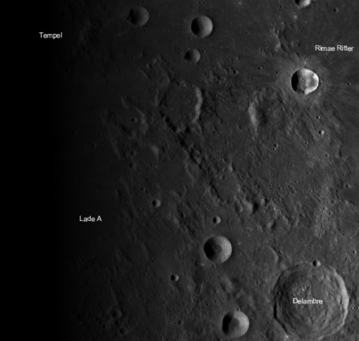 At the bottom left is Theon Junior, and west of this the terminator line follows the western rim of Lade E crater.