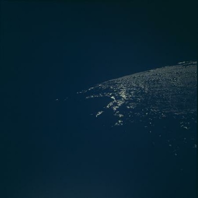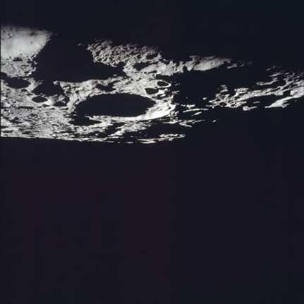 There are no specific references as to when this photograph, and its companions taken at the same time, were taken, but there may be clues in a passage in the mission transcript. At between 86:08 and 86:17 (during which they were on the far side), there are several references made to taking photographs. LOS on this orbit was at 85:42, with AOS due at 86:38 this would put them roughly in the right location for the Korolev basin -