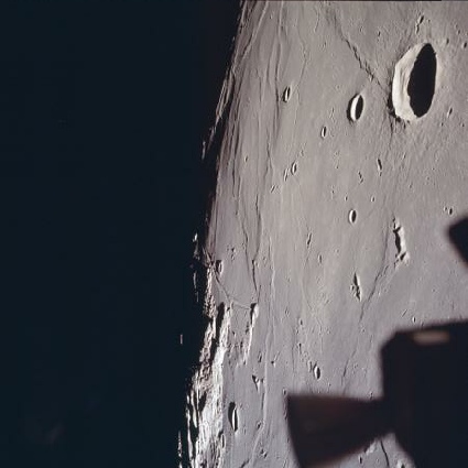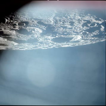 While there aren’t any specific references to photography at the time chosen, they are evidently in orbit, which puts it beyond the LOI burn that took place just short of 04:00 and the lunar terminator has moved on since the view taken in the TV broadcast. The surface area covered and the curvature of the horizon also suggests that it was before the orbit circularisation burn at 08:10, which reduces the ellipse of the initial orbit after LOI and also reduces altitude. Thankfully, our resident pseudoscientist Brian has pronounced himself happy with this photograph -
