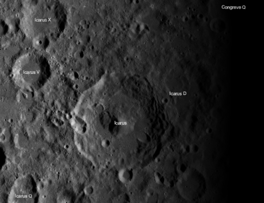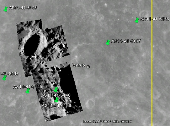 The view from the Apollo photograph is looking across towards Congreve crater from a position on the west of Icarus, although it is conceivable that other locations are possible. The locations of the overlays are, however, beyond doubt and are very obviously the western rim of Icarus. The length and depth of shadows confirms that these are near terminator photographs, while AS11-