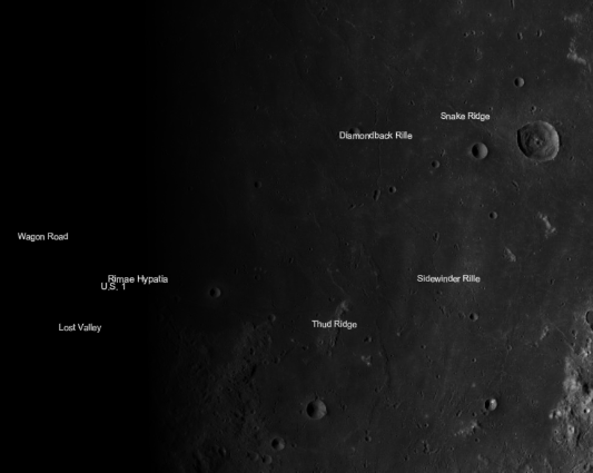 The crater in the top right of the Apollo image is Dionysus, westwards of which (towards the terminator) are Cayley and Whewell, followed by the eastern crater rim of Tempel, across which the terminator cuts.