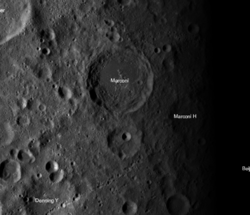 Although the differences are small (consistent with one revolution’s worth of time passing), Marconi is not lit the same in the two photographs. More of the inner crater is lit in the earlier one than the later one -