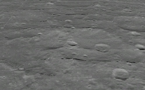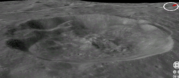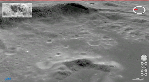 It’s even more evident in Japan’s 3DGIS software, shown here below right looking roughly north across the crater, and below left in an original Kaguya image: