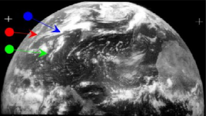 It is, as usual, obvious that the Apollo image matches the satellite images for the date in question, displaying distinct features not visible in the same configuration on preceding or subsequent days. Particularly obvious are the large 'X' shaped formation over the north Atlantic (marked by the blue arrow in the preceding figure), and the elongated 'C' shape to the south-