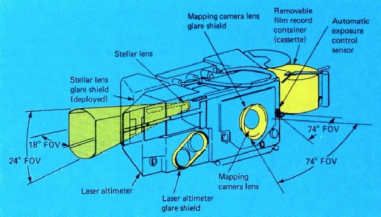 Another area of stellar photography that has not been possible to explore is that of the stellar mapping camera used in the Metric Mapping Camera system employed on Apollos 15 to 17. The stellar camera was used to provide a way of locating the Apollo Command and Service Module in space in combination with a laser altimeter. It’s show in the images below, courtesy of this page.