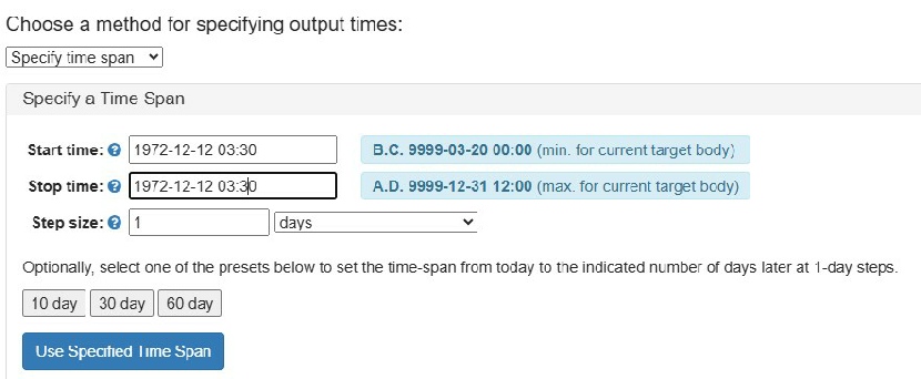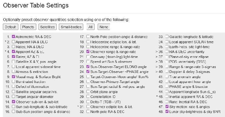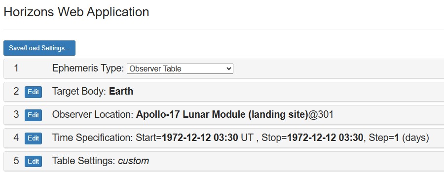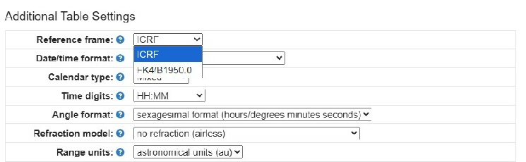 As you can see, the Observer settings are done in step one of the whole process, not within the table settings. There is no option to select ‘IAU_MOON as a reference frame, just ICRF (International Celestial Reference System) which has a coordinate system in the barycentre of the solar system, or FK4/B1950.0, an older version of the same sort of celestial reference system. I’m not even going to pretend to understand how they’re calculated or what the difference is, we’ll just go with the default of ICRF, seeing as stray’s option just isn’t there. You can choose IAU_MOON as a coordinate system in JPL’s SPICE packages, but it isn’t available here. This document suggests it isn’t a suitable reference frame for high accuracy lunar orientation, but again, the technicalities are beyond me. It’s moot: the option isn’t where stray says it is.